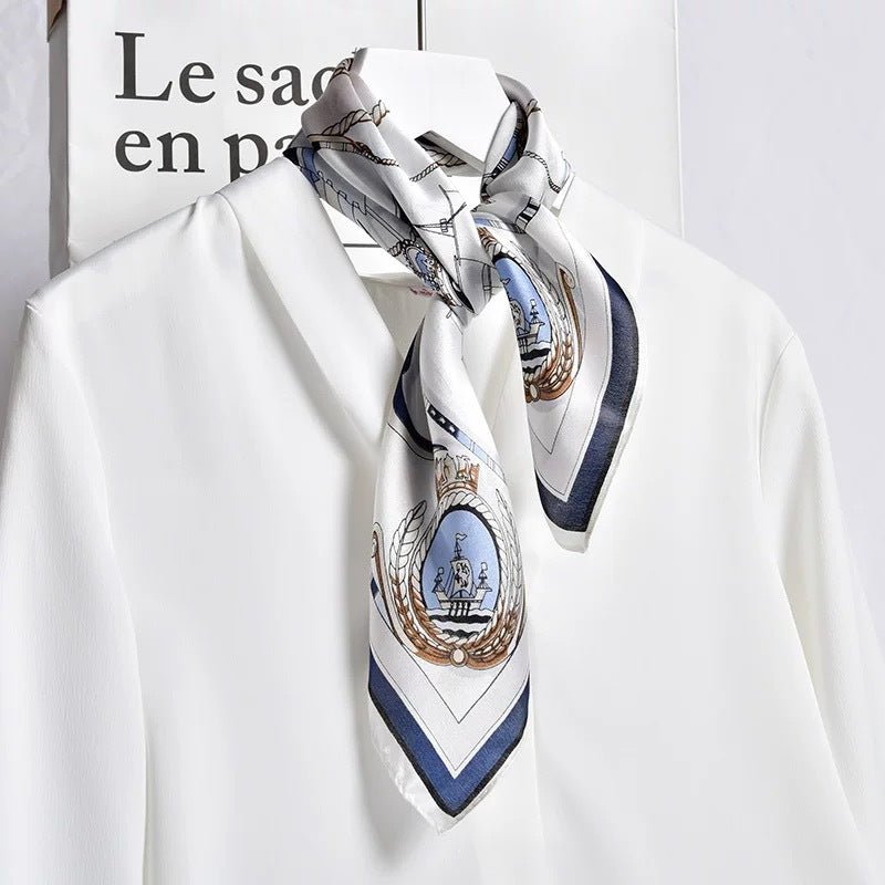 Nautical Print Silk Square Scarf - Classic Maritime Pattern with Anchor & Sailboat Design for Women & Men