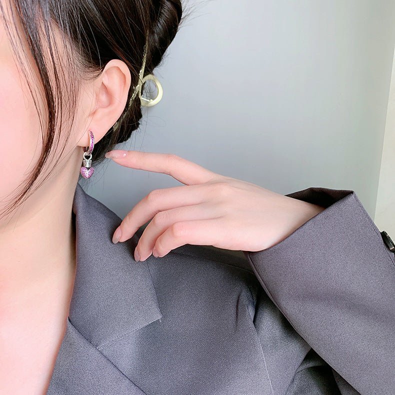 These earrings dare to be different. One earring showcases a textured cross drenched in purple zircons, while the other features a crown-adorned heart—also encrusted with the same vibrant stones. The asymmetric silhouette adds a playful, avant-garde touch, making them a standout piece in any outfit.