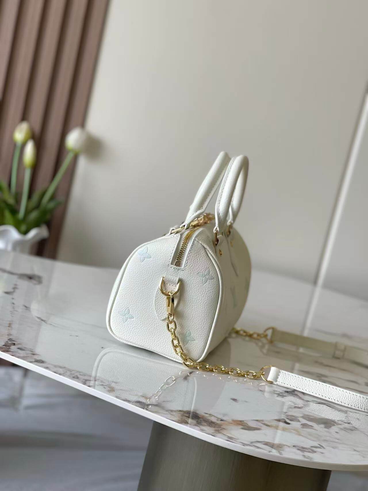 Experience the perfect harmony of heritage design and contemporary flair. Our Speedy Bandoulière 20 is masterfully crafted from premium grained cowhide leather, featuring the iconic monogram motif delicately heat-embossed in refreshing pastel tones. This structured mini doctor bag silhouette offers a sophisticated yet playful vibe, making it an essential statement handbag for your luxury collection.